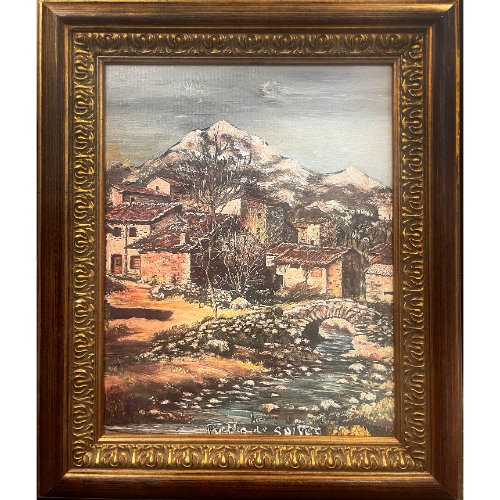 Paisaje del pueblo de Sotres, óleo sobre lienzo con marco clásico.