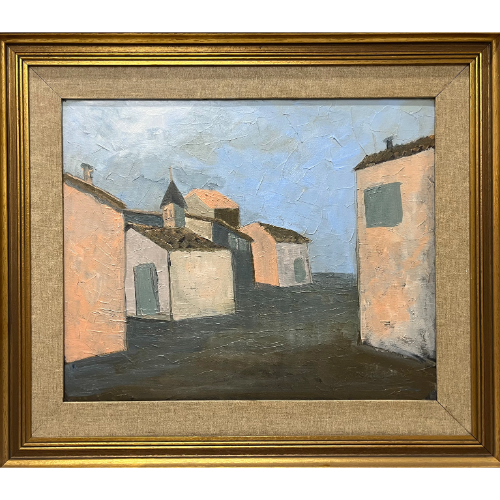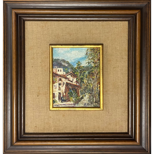 Pueblo asturiano con hórreo, al óleo y con marco clásico.