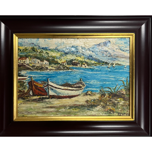Pequeña marina con marco de madera azul ornamentada.