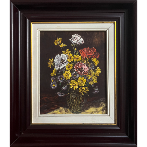 Bodegón floral con marco de madera oscura.