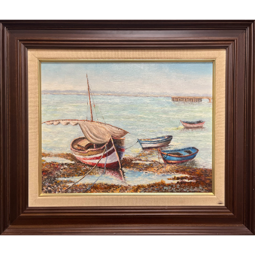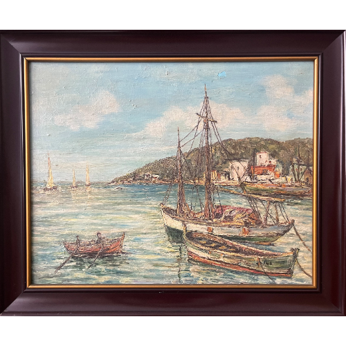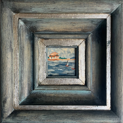 Pequeña marina enmarcada en madera.