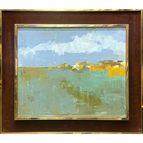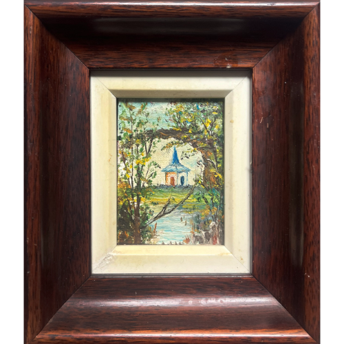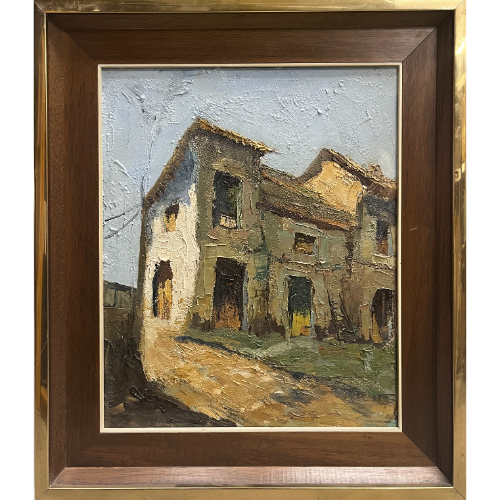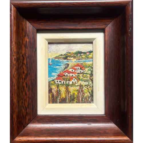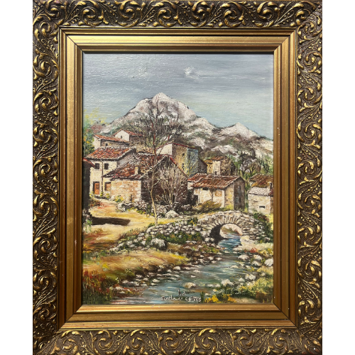 Pequeño pueblo al óleo parte de una serie, enmarcado.