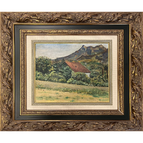 Paisaje al óleo con marco ornamental.