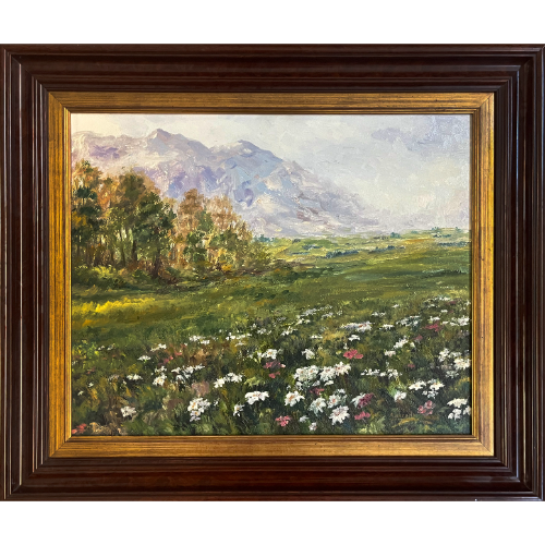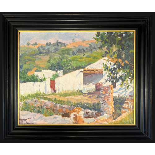 Paisaje figurativo al óleo, marco de madera negro.