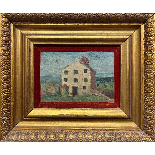 Pequeño óleo enmarcado en terciopelo rojo y madera dorada.