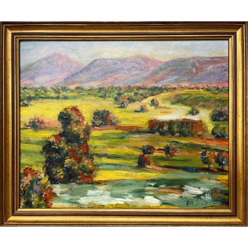Paisaje al óleo con marco dorado.