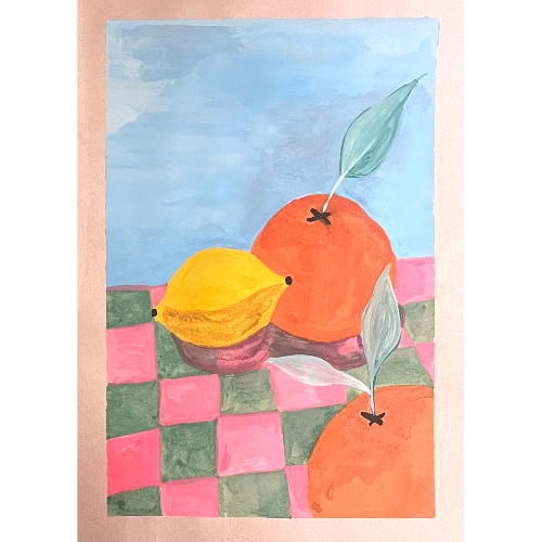 40,00€ – 100,00€ /semanaBodegón de fruta sobre mantel, gouache en papel gris.